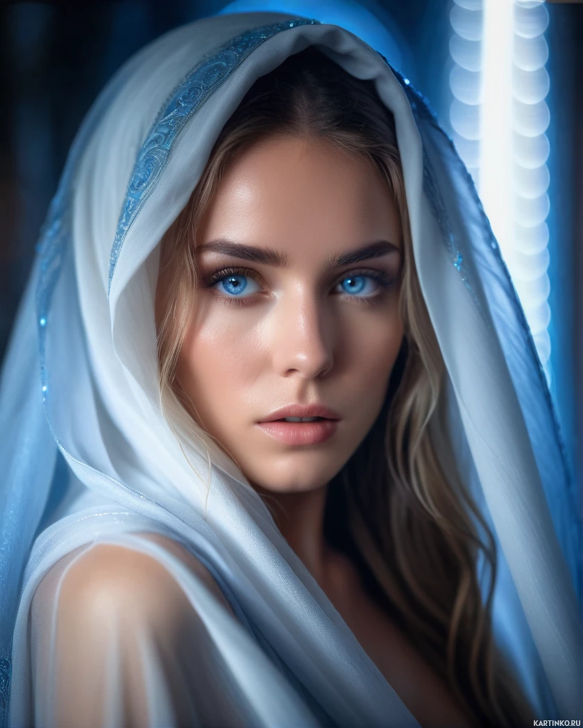 an ethereal cloak draped over one shoulder and the front of her body. The cloak has a sheer quality that allows the light to pass through it, creating an otherworldly effect around her figure. It's designed with a shimmering texture and is embellished with sparkling particles that catch the light. Her gaze is directed off to the side, and there's a soft, ethereal glow surrounding her face, which adds to the dreamlike quality of the image. The overall mood of the photograph is one of elegance, mystique, and celestial beauty.