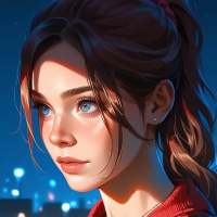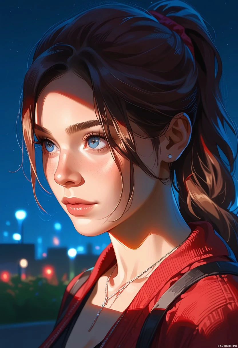 blue eyes, and her expression is neutral as she gazes to the side. She wears a red jacket over