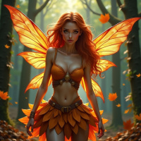 red hair and is wearing an outfit that resembles traditional fairy attire, consisting of a corset and short skirt, both adorned with leaves. The setting includes trees with autumn foliage, suggesting it could be during