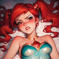 a female character with red hair styled in pigtails. She has a determined expression on her face and is wearing