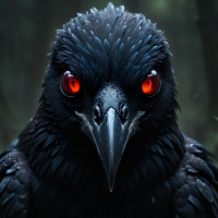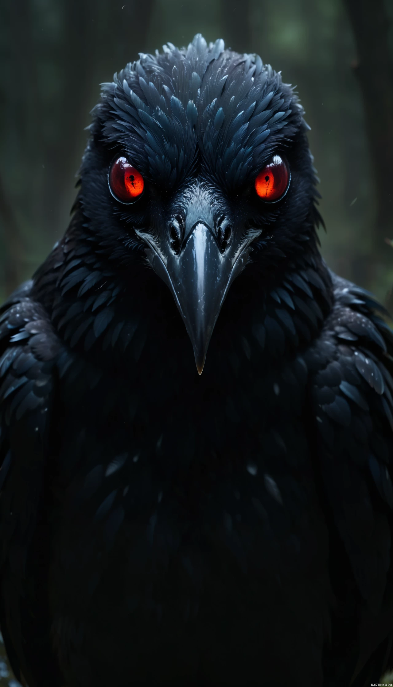In the image, there is a close-up of a crow perched. The crow's eye glows red, and its feathers appear wet, indicating that it might be in an environment with water nearby or that it has just been through some form of precipitation. The bird is facing towards the viewer with