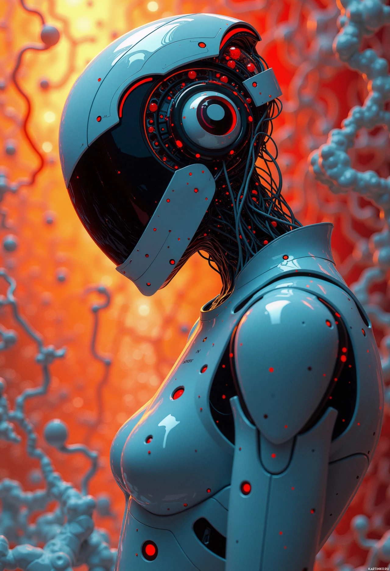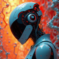 mechanical parts like the chest and arms that are reminiscent of a traditional robot. Its eyes have glowing red and blue lights around them, adding to its artificial appearance. The background consists of what appears to be molecular structures in vibrant colors like red and orange against a black backdrop, which could imply the setting is inside a cell or some form of microscopic environment, possibly indicating