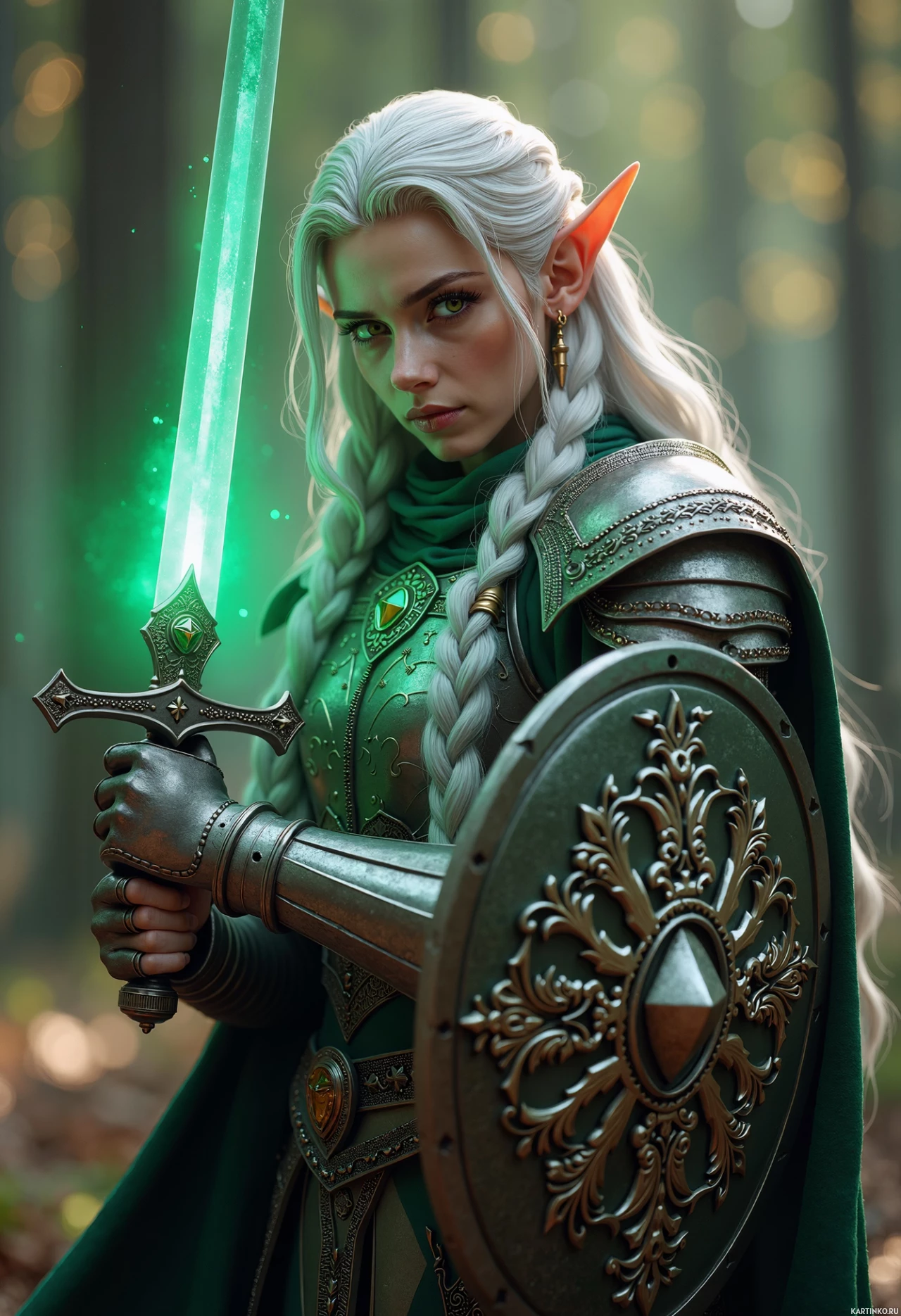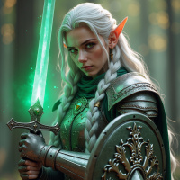 white hair and is wearing green armor with gold accents, suggesting a blend of nature and nobility in their attire. They are holding a sword with a glowing green hilt, which is likely to represent magical or enchanted properties within the fantasy context. The character's expression is serious, and they appear ready for battle. Behind them, there is a forest setting that includes trees and