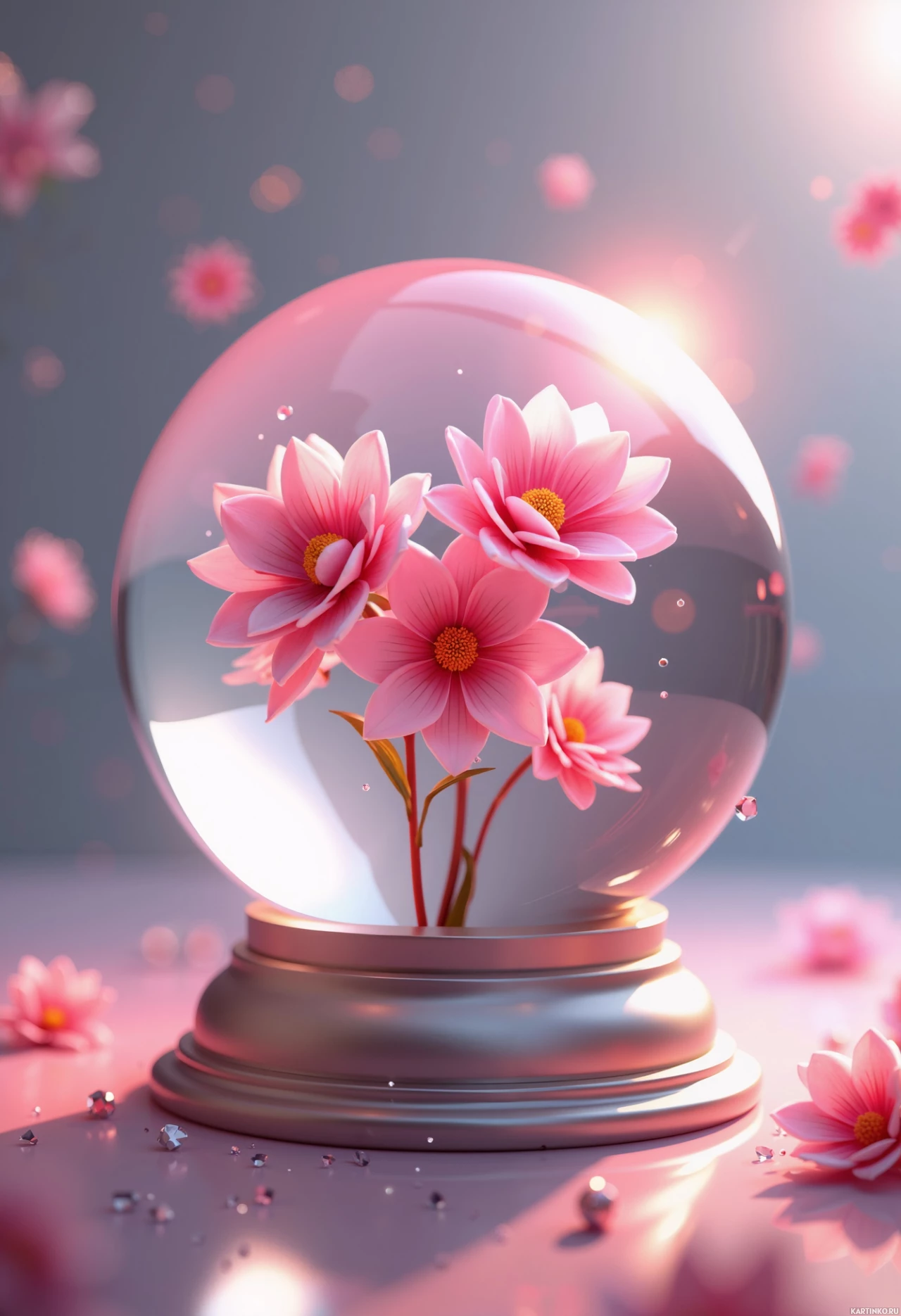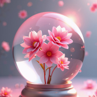 a pink flower with several layers of petals and a golden center, resting inside a glass globe. The globe itself appears to be floating in the air, as suggested by