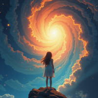 The image features a young girl standing on a rocky outcropping against a backdrop of a swirling galaxy or nebula in vibrant hues of red, orange, and yellow. She is dressed in light, ethereal clothing and has her hair caught by the wind, adding to the dynamic feel of the scene. In front of the galaxy, there are clouds that seem to be illuminated by the celestial phenomenon behind her. The overall mood of the image is one of wonder and tranquility.