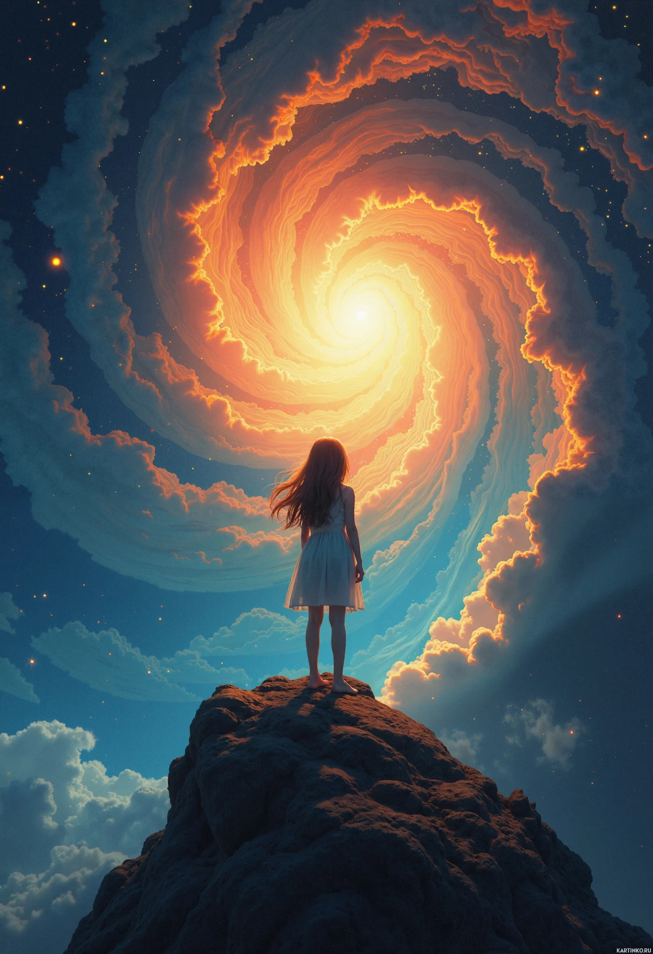 На картинке запечатлена молодая девушка, стоящая на скалистом выступе на фоне галактики или туманности, переливающейся яркими оттенками красного, оранжевого и жёлтого. На ней лёгкая, воздушная одежда, а волосы развеваются на ветру, создавая ощущение движения. Перед галактикой видны облака, будто подсвеченные небесным свечением. В целом картинка наполнена ощущением чуда и спокойствия.