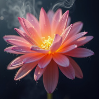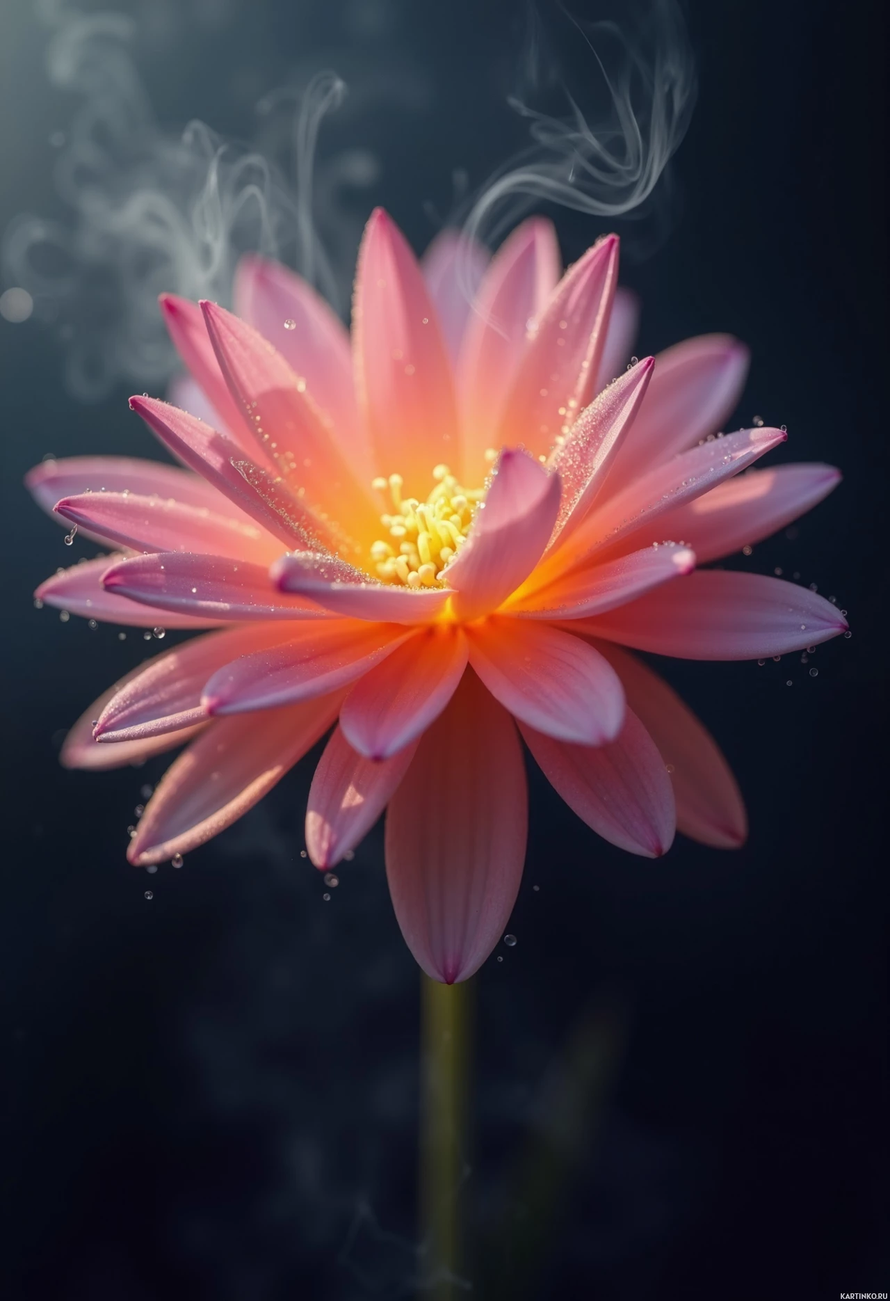a dark setting with hints of blue, which might suggest an evening or nighttime atmosphere. There's a subtle hint of steam rising from the ground, adding