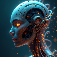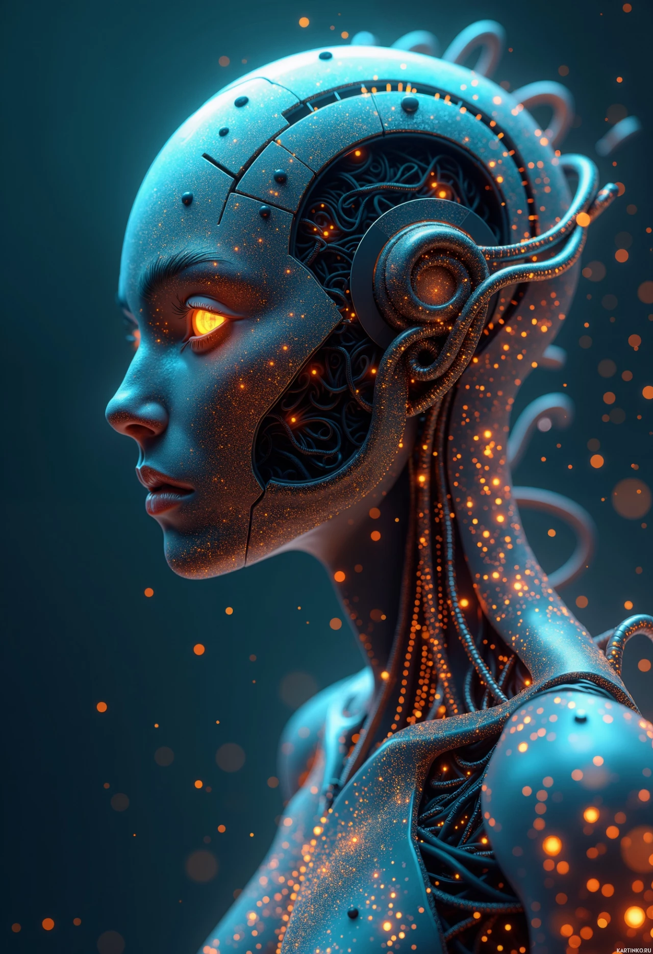 an ethereal glow, further enhancing its futuristic appearance. This character could possibly represent a theme often explored in science fiction literature and media—the intersection of technology and humanity.