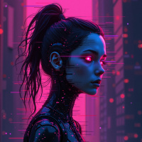 dark hair and is wearing an outfit that suggests a futuristic or science fiction theme, potentially made of a metallic material with geometric shapes. Her skin appears to have a glowing effect, possibly due to light from the background, which adds to
