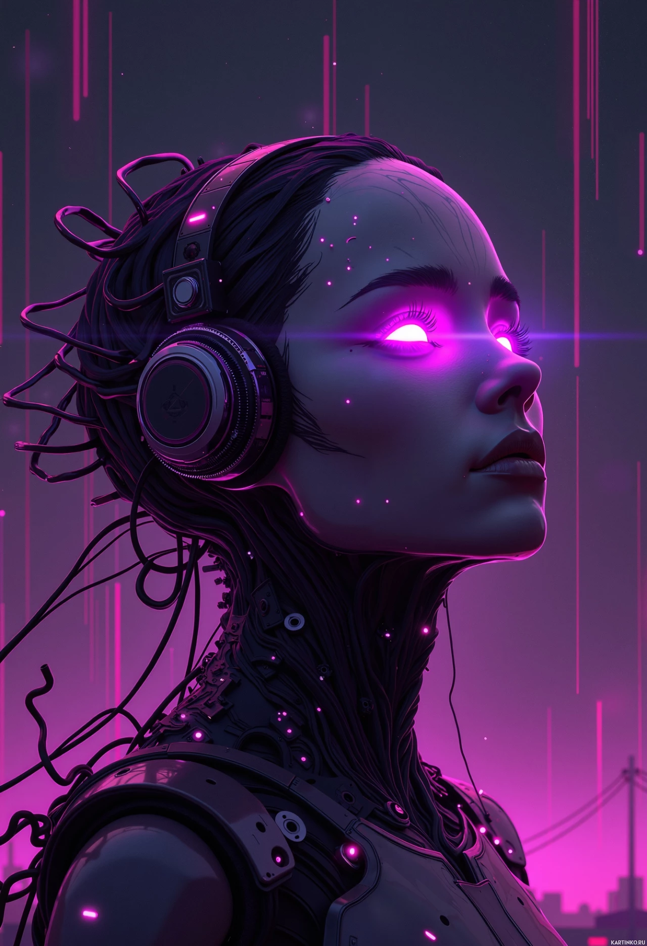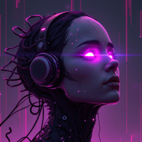futuristic headphones that seem integrated into its design. The character's eyes glow with a purple light that may suggest