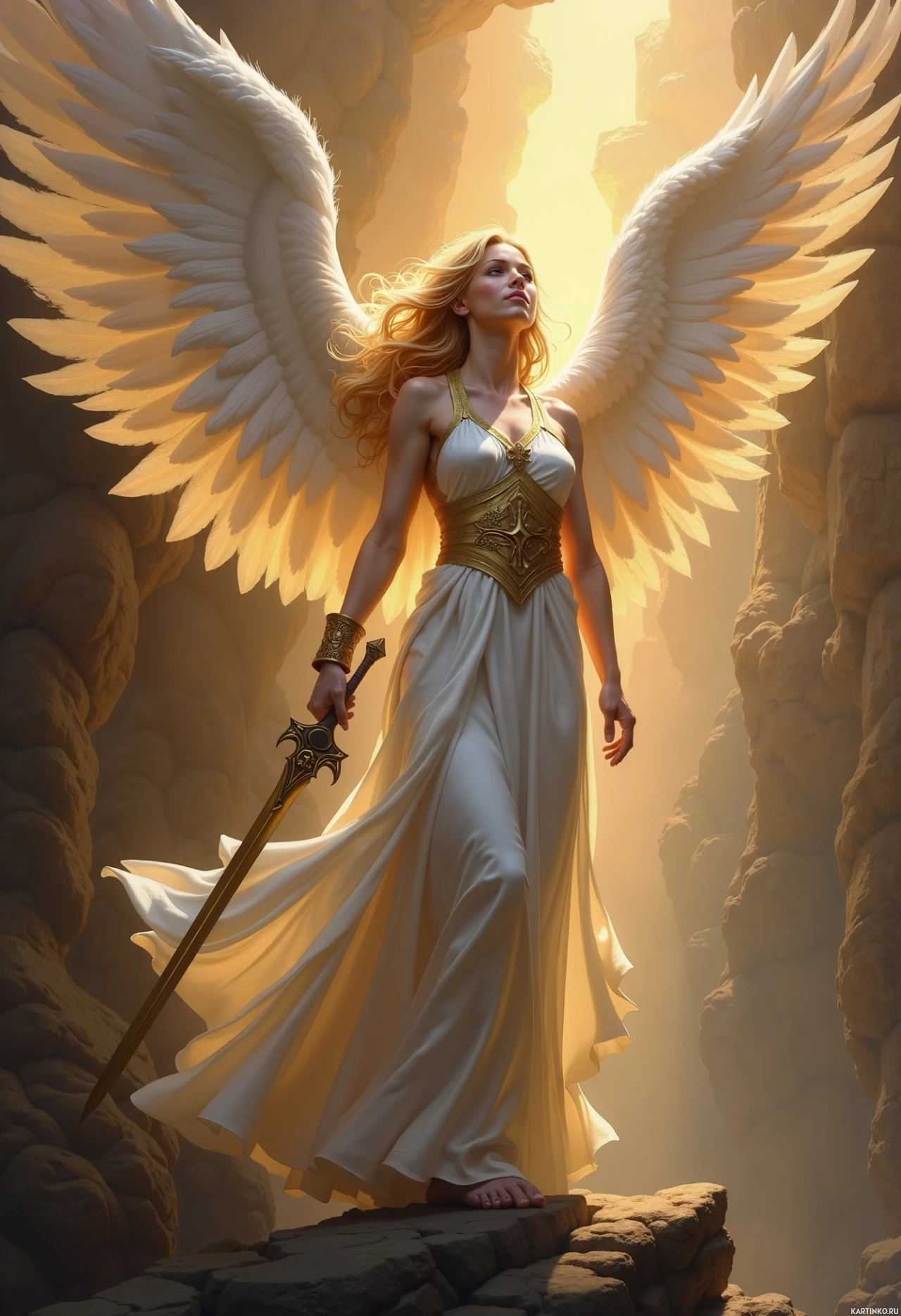 blonde hair styled in voluminous waves, giving her an ethereal appearance. In her hands, she wields a sword and a shield, suggesting she might be a warrior or protector. The background is a rocky landscape, likely within a cave system, with light filtering through to cast dramatic shadows and highlights on