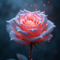 The image shows a single rose with petals in shades of pink and white, set against a dark background that resembles night sky. The rose has a luminous quality to it, suggesting it is lit from within or illuminated by a soft light source. There are sparkling particles floating near the rose, which gives a magical or dreamlike atmosphere to the image. The rose is on a stem with leaves and buds at its base, also glowing in this ethereal manner. The style of the image appears to be a digital artwork, likely created for purposes such as illustration or artistic expression.