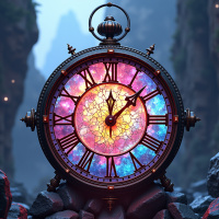 a grandfather clock positioned in the foreground with a dramatic and fantastical background. The clock has a face that resembles an analog clock, complete with