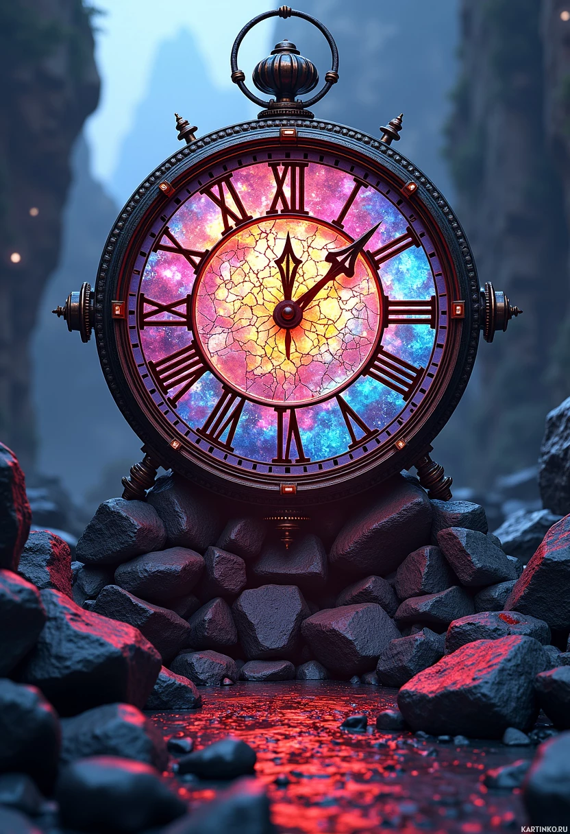 Roman numerals at the 12, 6, and 9 o'clock positions. There are rocks around the base of the clock on a ground that appears to be volcanic lava or molten rock, suggesting a magma-