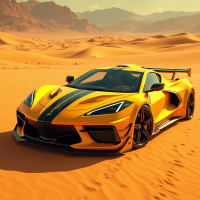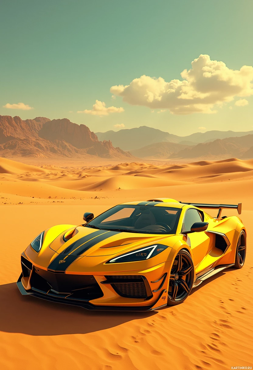 sleek design with prominent air intakes and large wheels. In the background, there's a sandy landscape under a clear sky with subtle clouds, suggesting it might be early morning or late afternoon due to