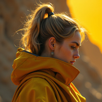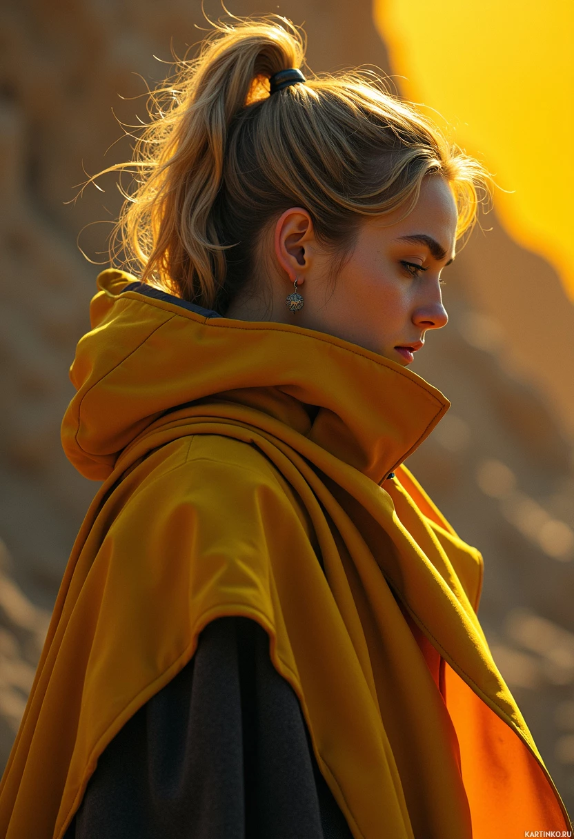 blonde hair. She has her hair styled up and is wearing makeup that accentuates her features. Her expression is neutral or contemplative as she gazes off to the side, away from the camera. She is dressed in what looks like a raincoat with an orange hue, which stands out against the more