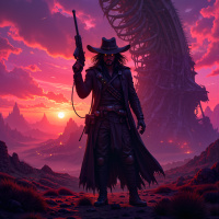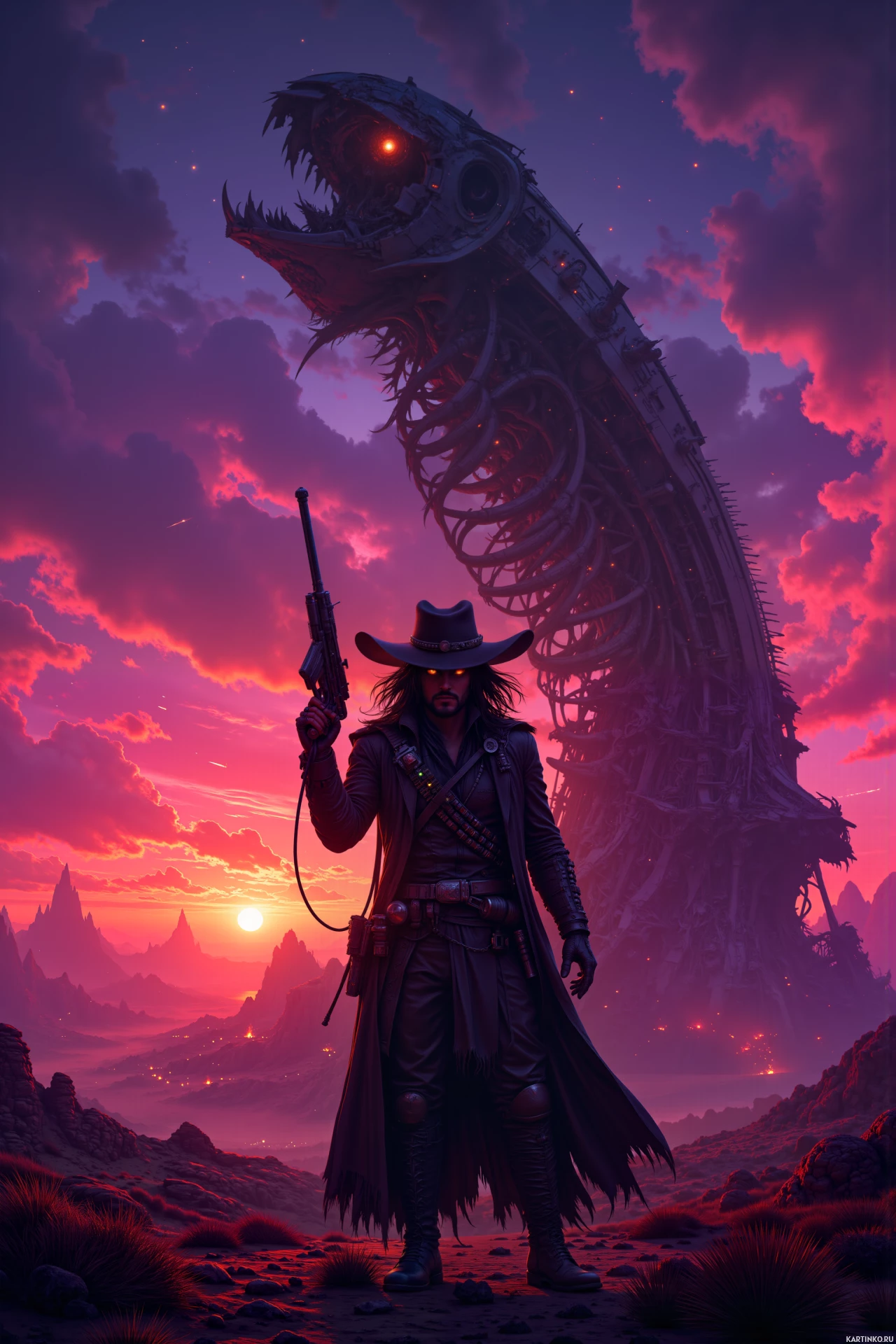 an armored body, spiky protrusions along its back, and a menacing mouth open wide as if it were about to strike. The setting appears to be a barren landscape during twilight, with a vibrant sky that transitions from blue to purple hues near the horizon. The contrast between the traditional cowboy attire of the man and the fantastical mechanical serpent creates an interesting juxtaposition in the image. The overall scene suggests a futuristic or alternate reality where elements of the Old West coexist with advanced technology or creatures not found in our natural world.