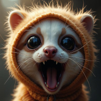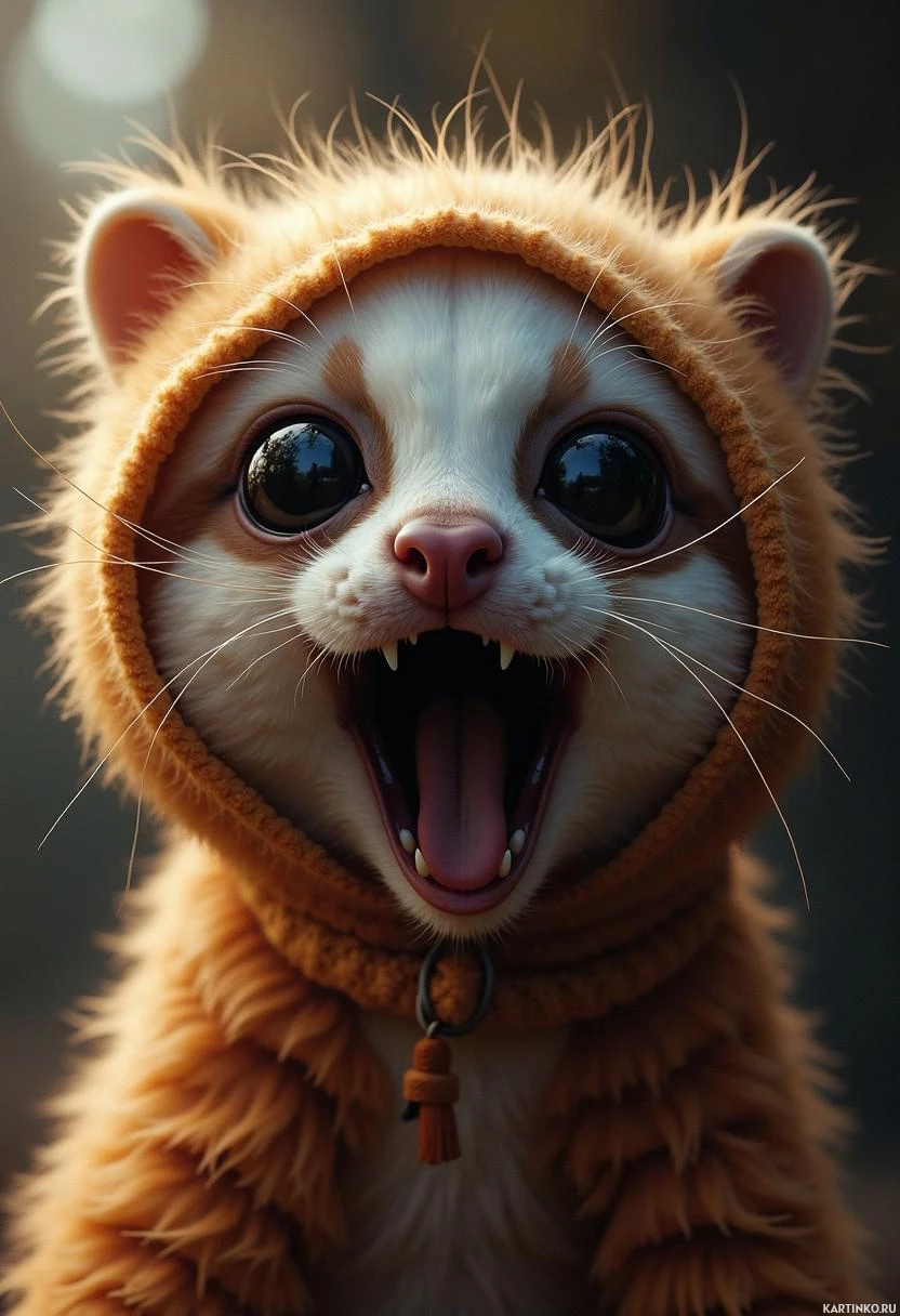 На картинке представлен трехмерный рендер антропоморфного персонажа, похожего на лису с человеческими чертами. У него мех, заостренные уши и большие глаза – типичные характеристики для этого вида. У лисы выражение удивления или испуга: рот открыт в крике, видны зубы, что передаёт момент сильной эмоции. Персонаж одет в капюшон, который, кажется, сделан из ткани, возможно, напоминающей старую или поношенную вещь, вроде пальто или плаща. Текстура капюшона выглядит мягкой и слегка изношенной, с бахромой внизу, что добавляет ему вида старины. Общий стиль картинки напоминает цифровую графику, созданную для придания животному персонажу человеческих черт и выразительности.