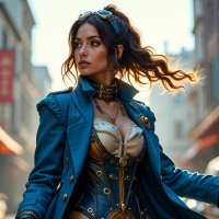 a distinctive fashion that may suggest a historical or fantasy context. Her outfit consists of a long