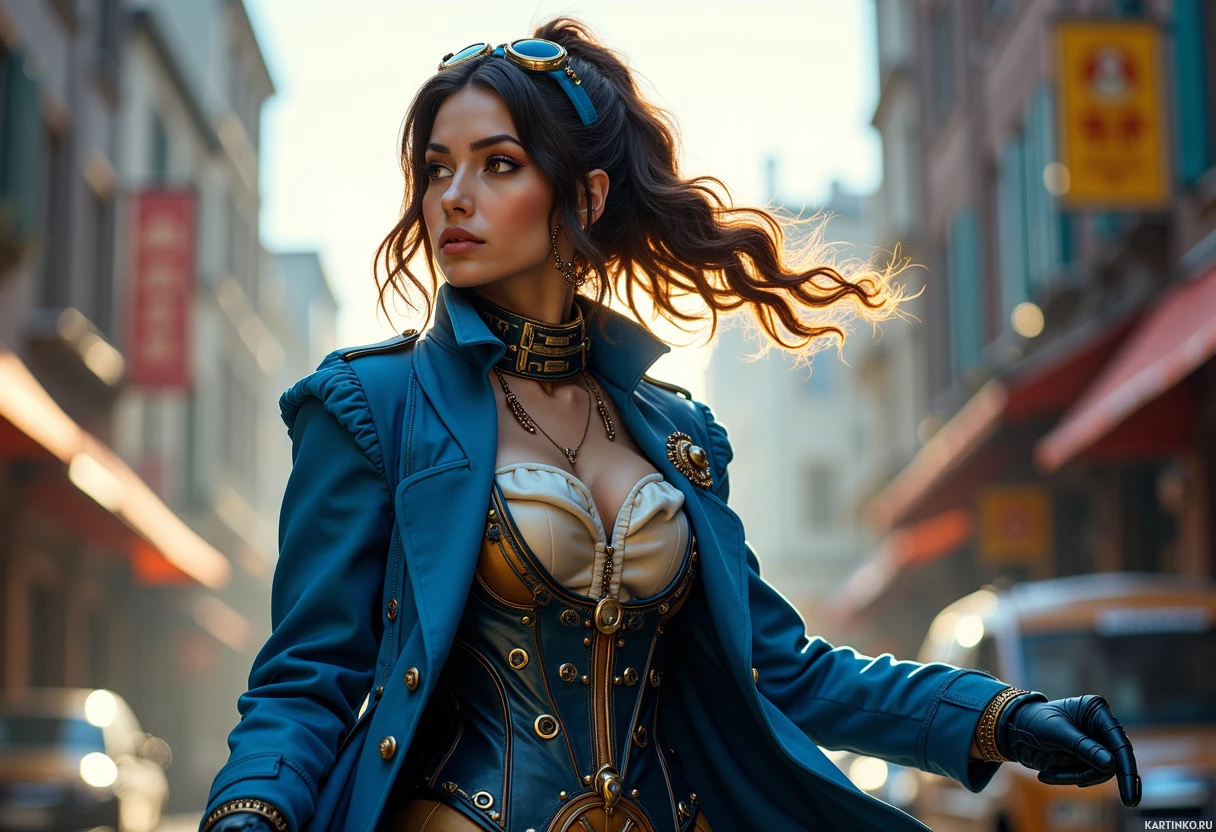 curly hair that flows around her head. The woman is standing on what seems to be a street during the daytime, as indicated by the sunlight casting shadows behind her. There are elements in the background such as buildings with signs, which suggest