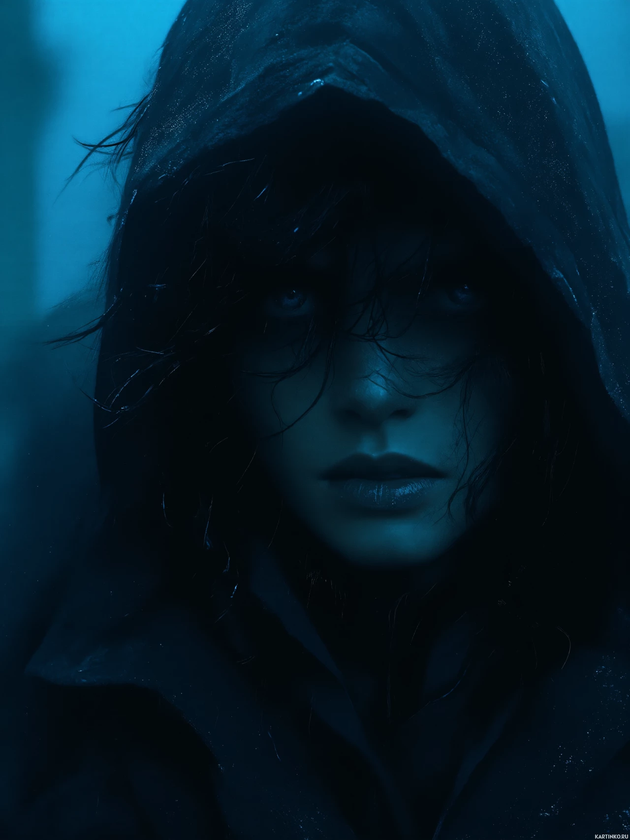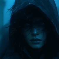 dark hair, and they appear to be looking off to one side with an intense expression on their face. The background is blurred but suggests a rainy or misty environment which contributes to the overall