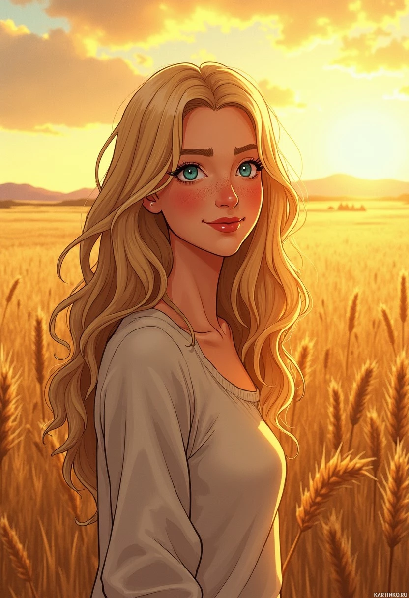 a gentle smile on her face. She is wearing a light beige top and stands against a backdrop of golden wheat fields that stretch out into the horizon under a clear
