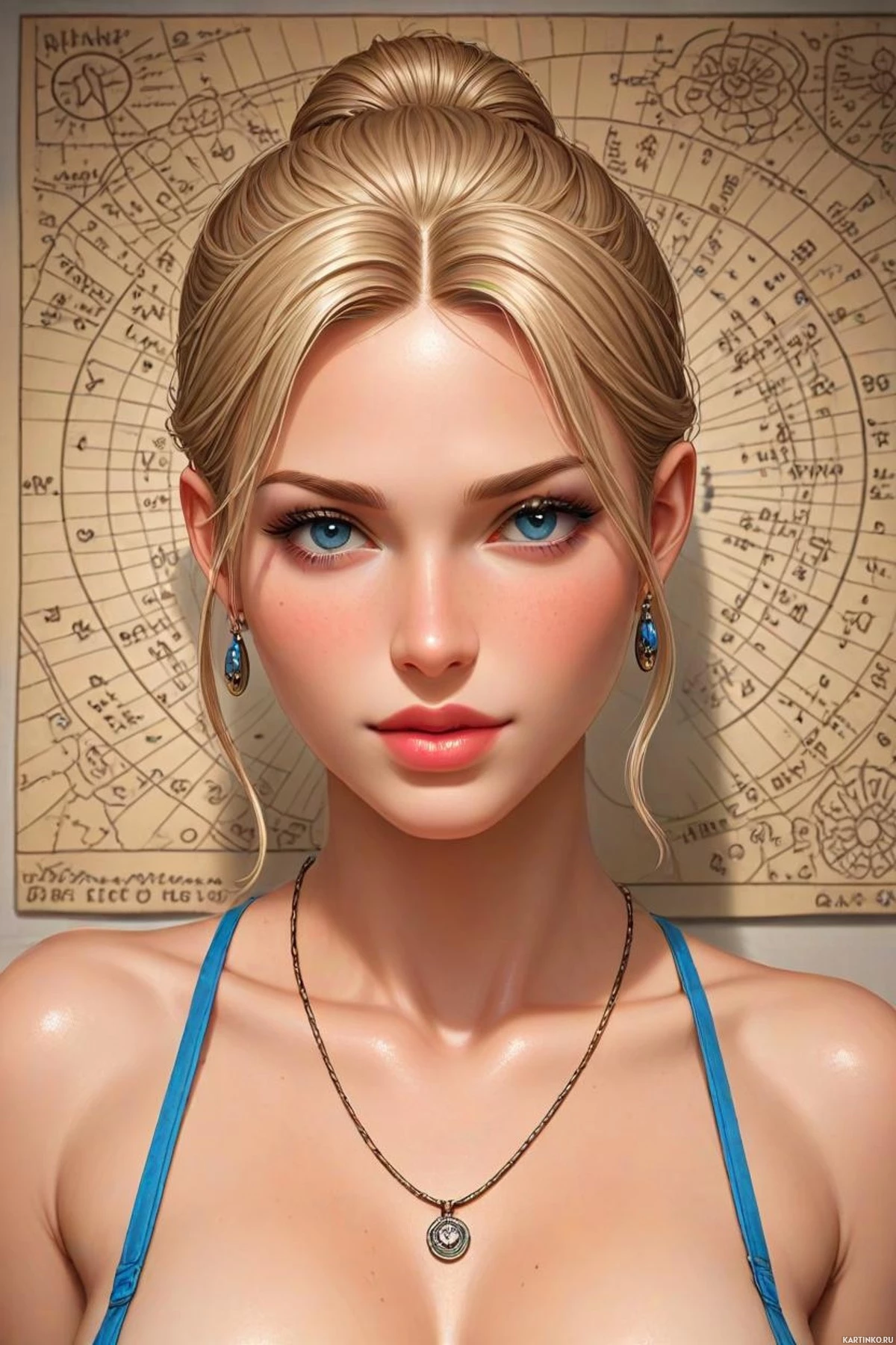 an impression of confidence and poise. Behind her head, there is a compass rose design on what looks like
