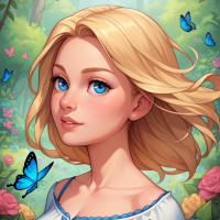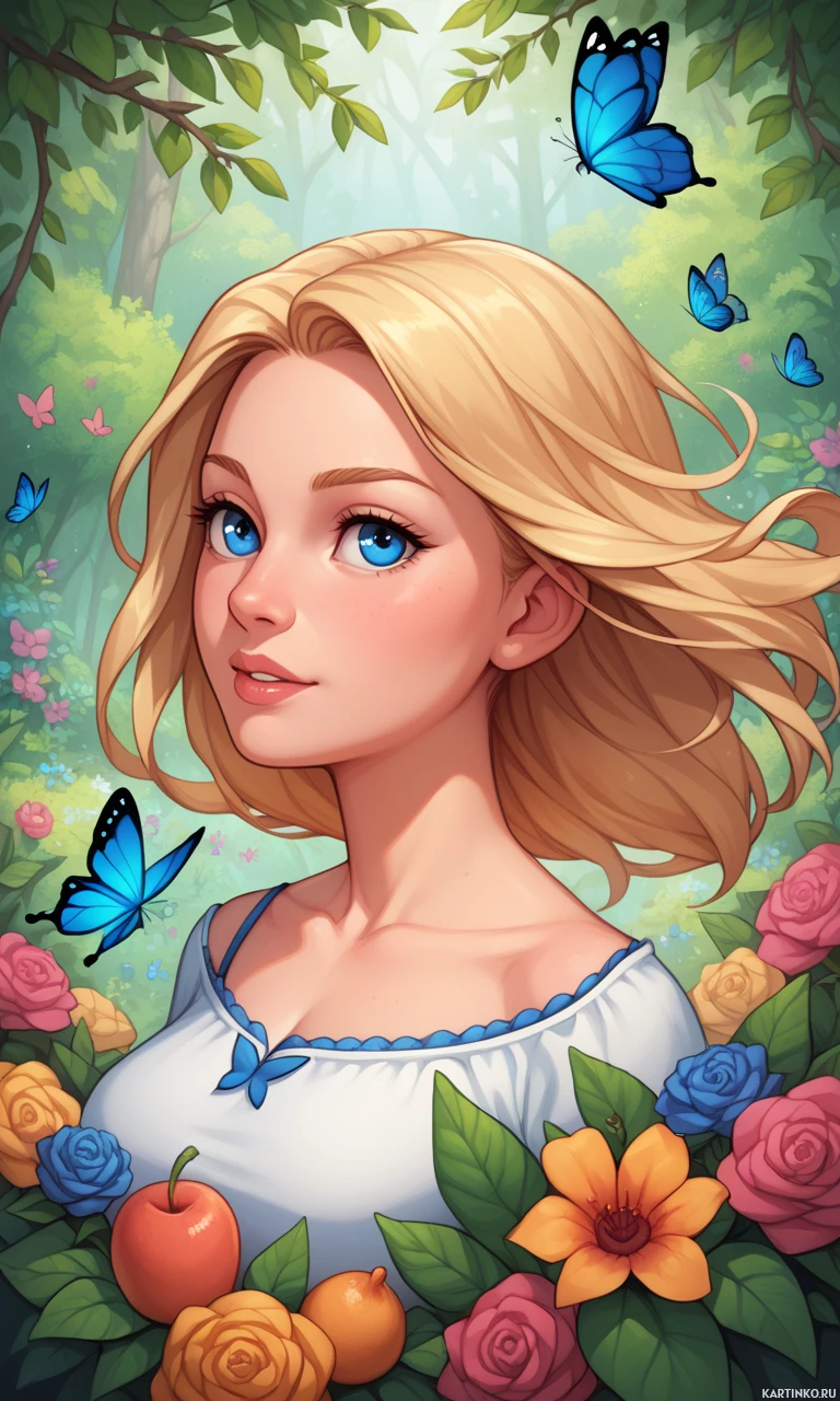 a contemplative expression. Around her neck, there are small butterflies fluttering, adding