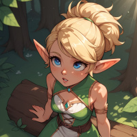 the surrounding foliage and the light filtering through the canopy overhead. The character has an intrigued expression, looking off to the side with her hands resting on