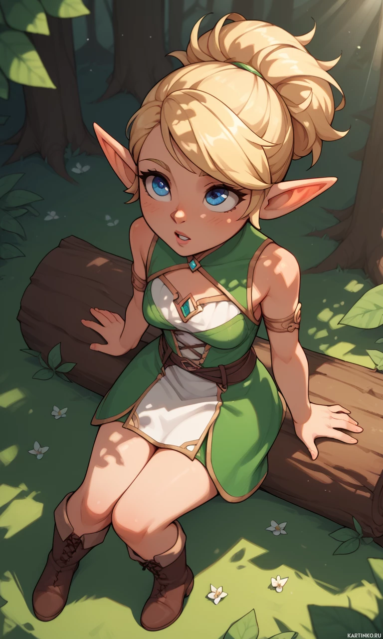 blonde hair and blue eyes, and is wearing a green dress with a white trim and brown boots. She's sitting on a tree stump in what seems to be a forest or woodland area, as indicated by