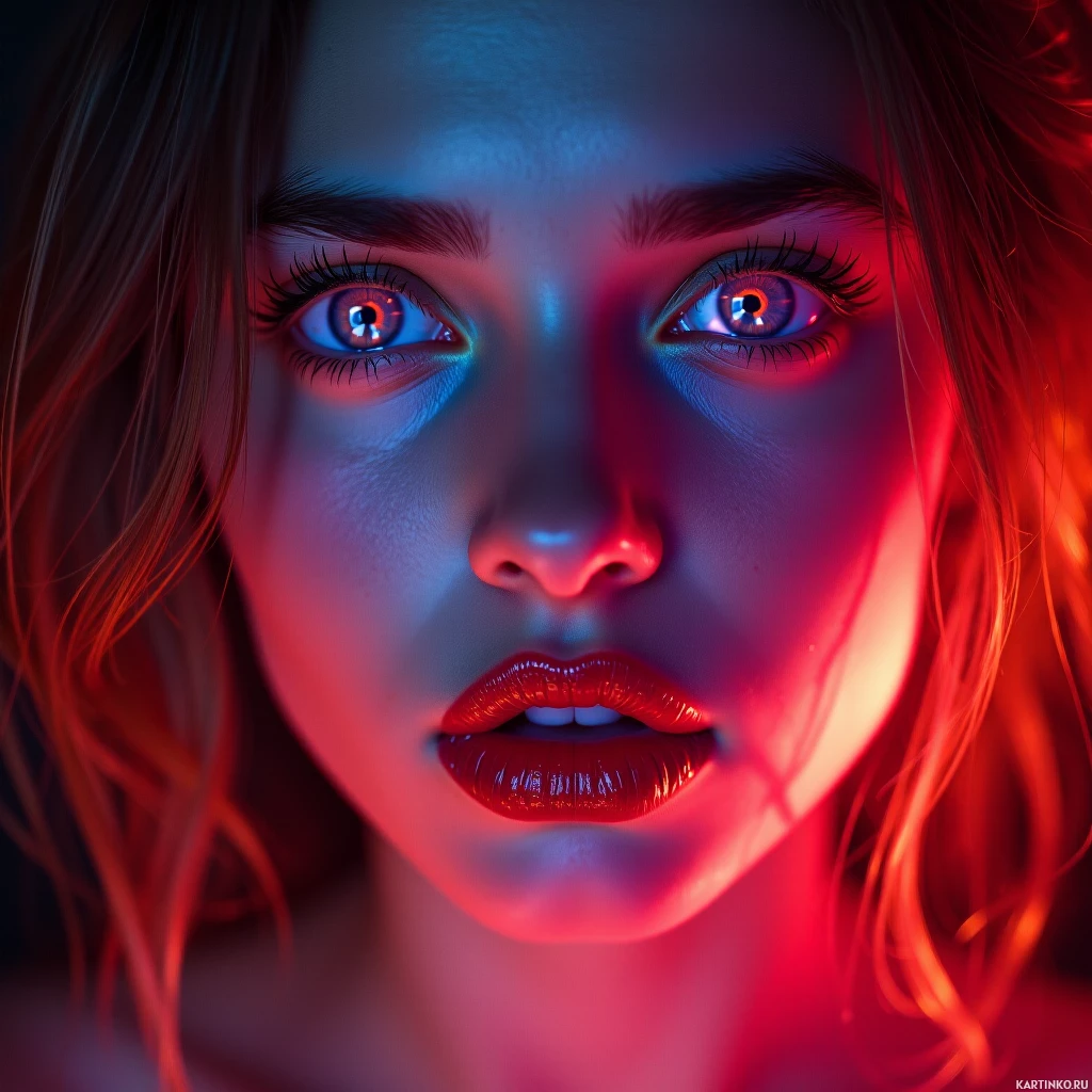 hues of blue, red, and purple that create a captivating atmosphere around her. The overall style of the image suggests it could be related to music, performance, or art given the dramatic and intense presentation.