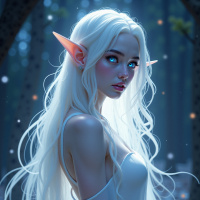 the fantasy genre's portrayal of elves. They are wearing a light-colored garment that suggests a gown or similar attire, and they stand with one hand near their hip and the other resting on their shoulder. The background features a forest setting at nighttime, as indicated by