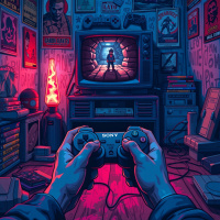The image depicts a person sitting in front of a television. In their hands, they are holding game controllers, suggesting they are playing