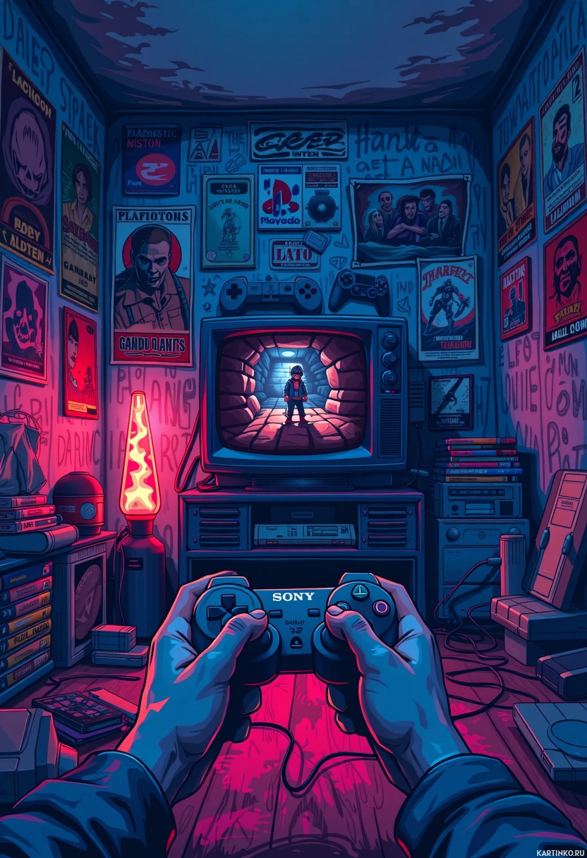 an interactive scene where the player's actions on the controller are reflected on the screen. The room has a dark and moody atmosphere, with