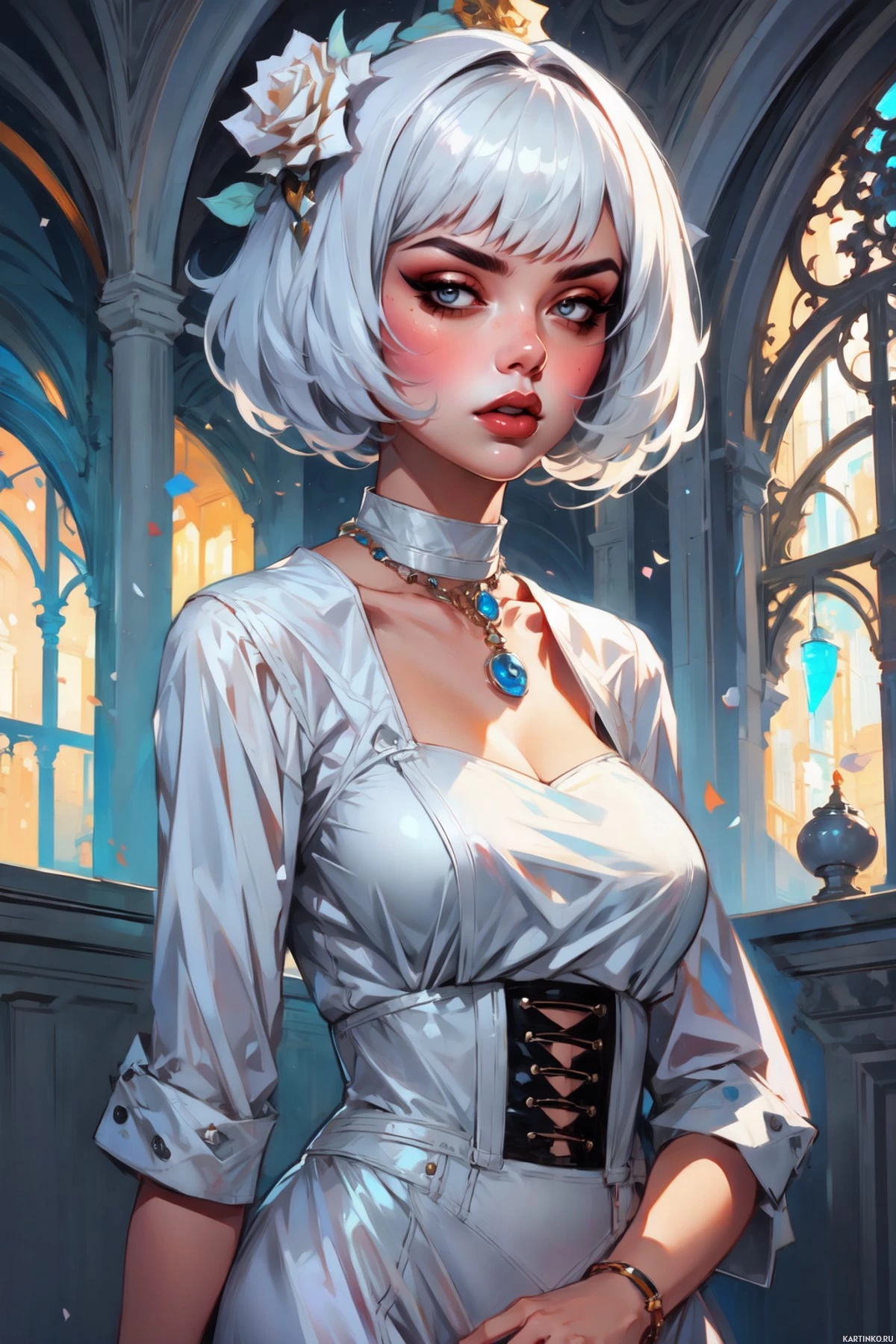 blue eyes and is accessorized with what seems to be a floral brooch on her right shoulder, giving her a sophisticated look. The background suggests an interior setting, possibly a castle or mansion, with stained glass windows featuring