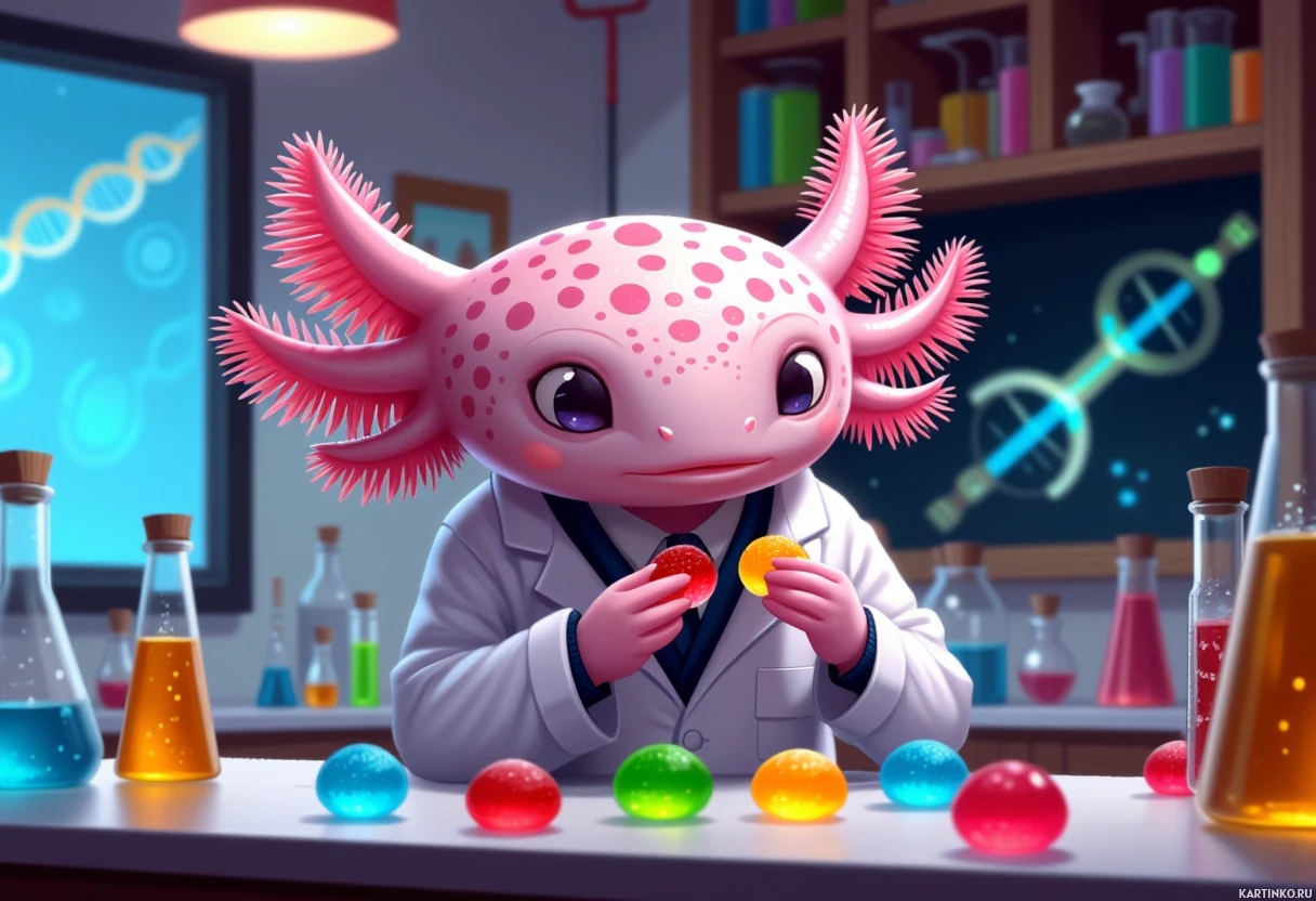 expressive eyes and is wearing a white lab coat over a pink shirt. It appears to be sitting at a laboratory bench covered with various scientific equipment and samples, including