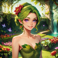 a slight smile on her face as she looks directly at the viewer. Surrounding her are vibrant floral elements, suggesting a garden or woodland setting. There's a variety of