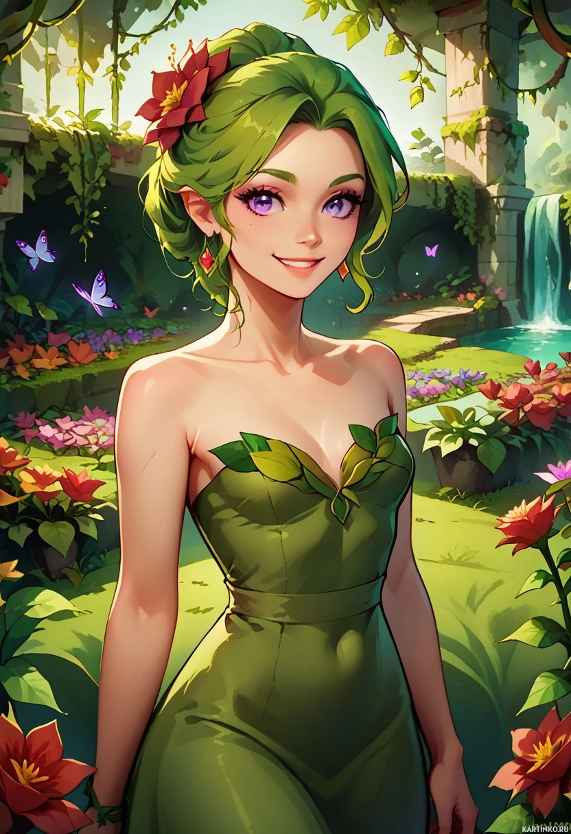 green hair, depicted in an illustration style. She has purple eyes and is wearing