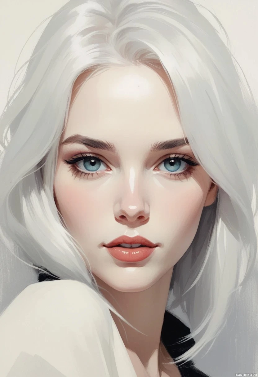 lip color. The character's hair is wavy and falls over her shoulders, while the eyes are large and prominent, giving her