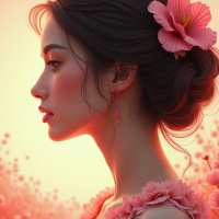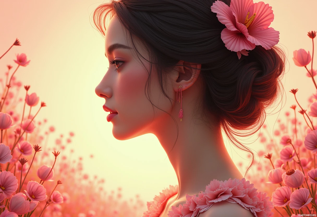 a young woman with long, dark hair and a fair complexion. She is wearing makeup that highlights her facial features and has earrings in her ears. Her attire appears to be a blush-colored dress with a neckline that frames her face elegantly. The background consists of a field of vibrant