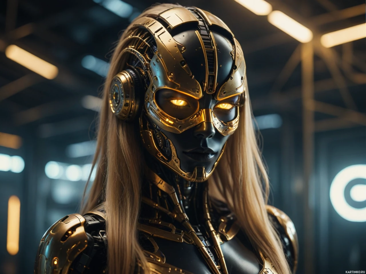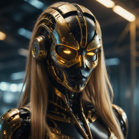 advanced technology. It has golden, glowing eyes and intricate circuit patterns on its face, giving it an appearance of advanced