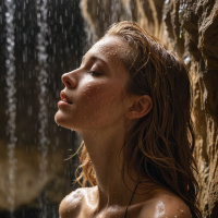 wet hair that suggests she may have been caught in the rain. Her expression is one of serenity or possibly contentment as she seems to be enjoying the moment. She is standing close to a waterfall, which adds a natural and refreshing element to the scene. The lighting and composition of the photo give it