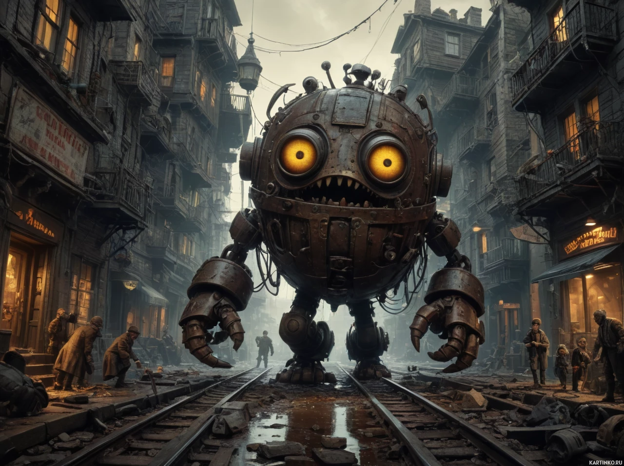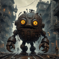 a science fiction scene featuring a robot in the center of an urban environment that appears to be in disrepair. The robot has large, glowing