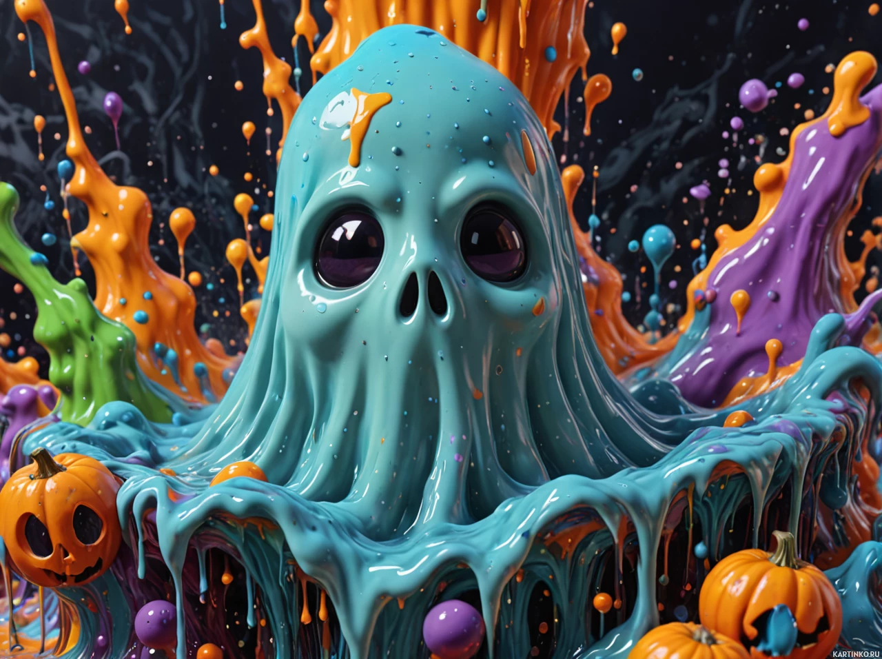 vibrant colors and patterns that resemble candy or paint splatters. This central figure is surrounded by an array of smaller elements: there are several pumpkins scattered throughout, some of which also have