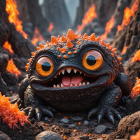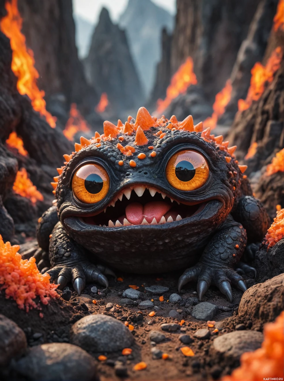 a volcanic environment with lava spewing out behind it. The creature appears to have