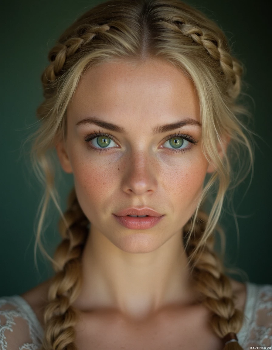a young woman with blonde hair styled in braids. She has
