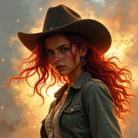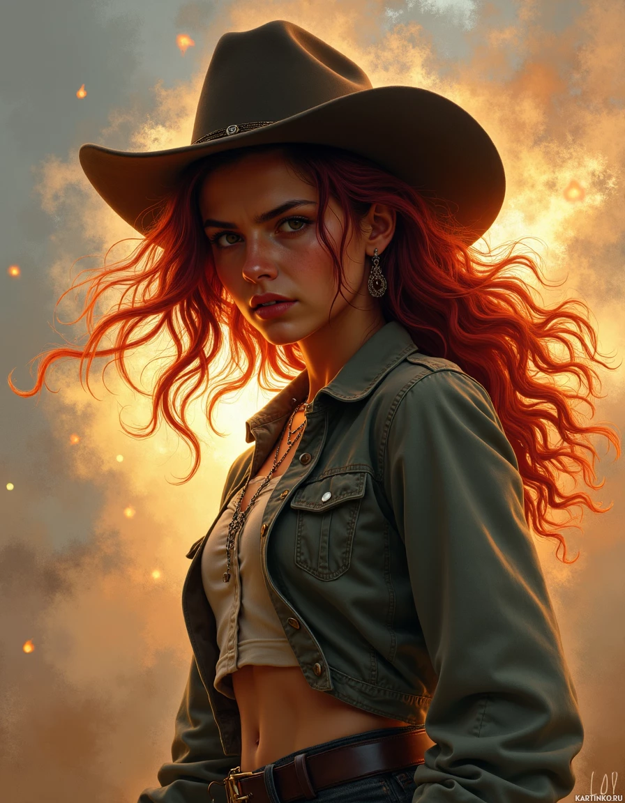 cowboy hat and a green jacket, giving her a rugged yet stylish appearance. Her gaze is directed straight at the viewer, suggesting confidence and self-assuredness. Behind her, there's an explosion in a grayish color with