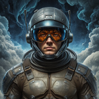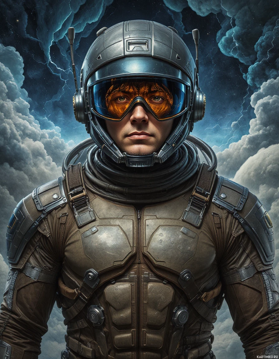 futuristic armor, reminiscent of a space suit. This individual is wearing a helmet with goggles on the front and appears to be seated in a pilot's chair within what seems to be