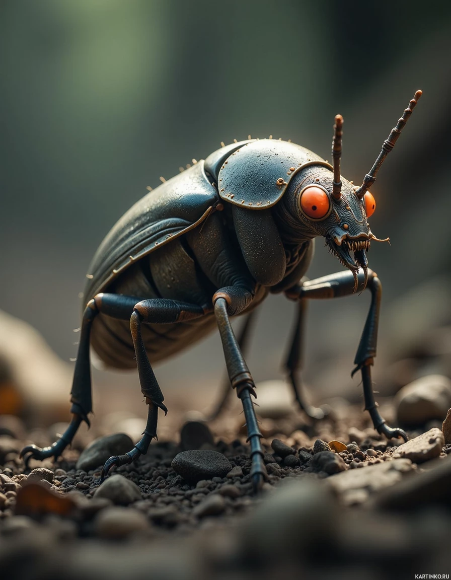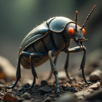 a forest floor due to the textures that resemble bark or wood chips. The focus is sharply on the beetle, making it the central subject of the image, while the surroundings are rendered in