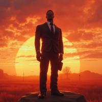 a dark suit with a tie, and boots that reach up to their knees or mid-calves. They are positioned facing towards the viewer with their arms resting at their sides. The sky is painted in